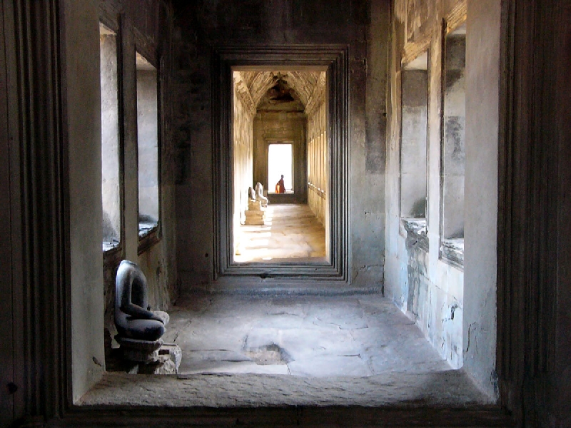 回廊には首を切られた仏像、遠くに首をつけた橙装の僧